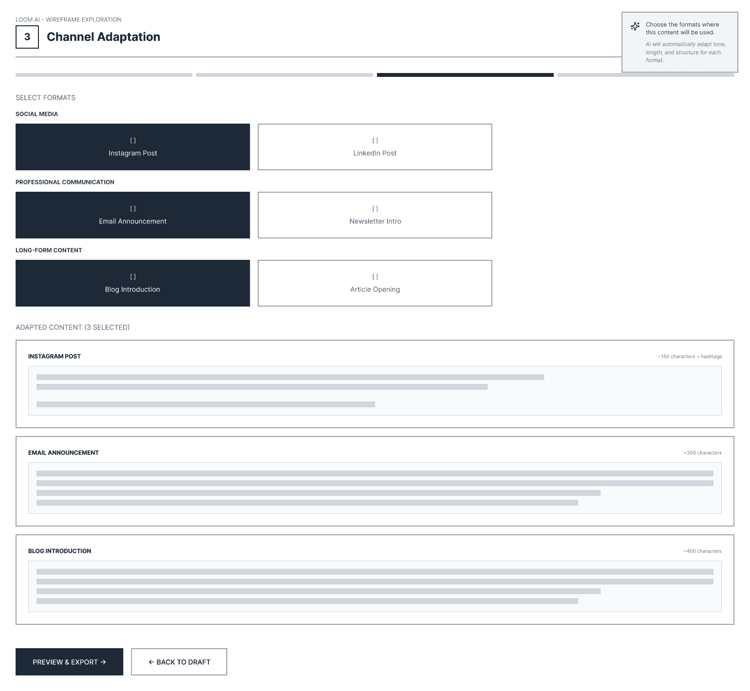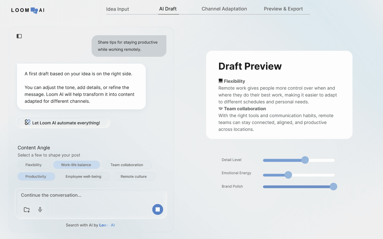 Instead of repeatedly rewriting the same idea for different contexts, users can generate and refine content with AI support, then adapt it for different channels.