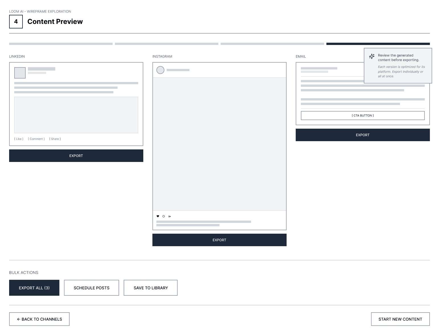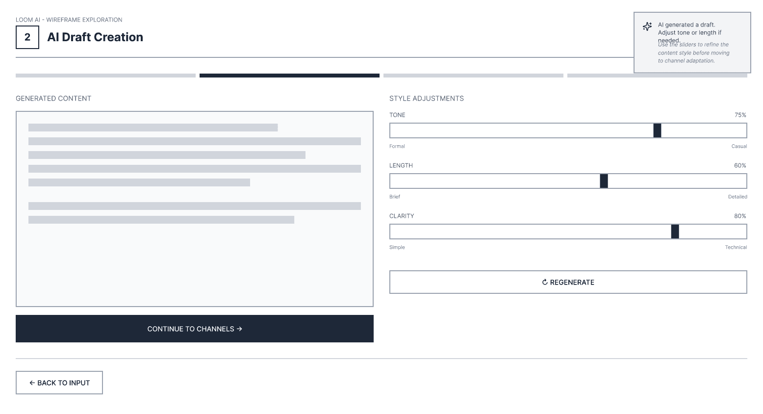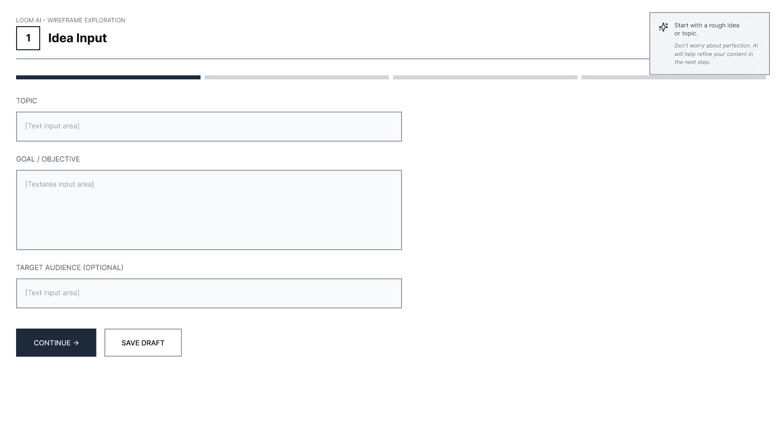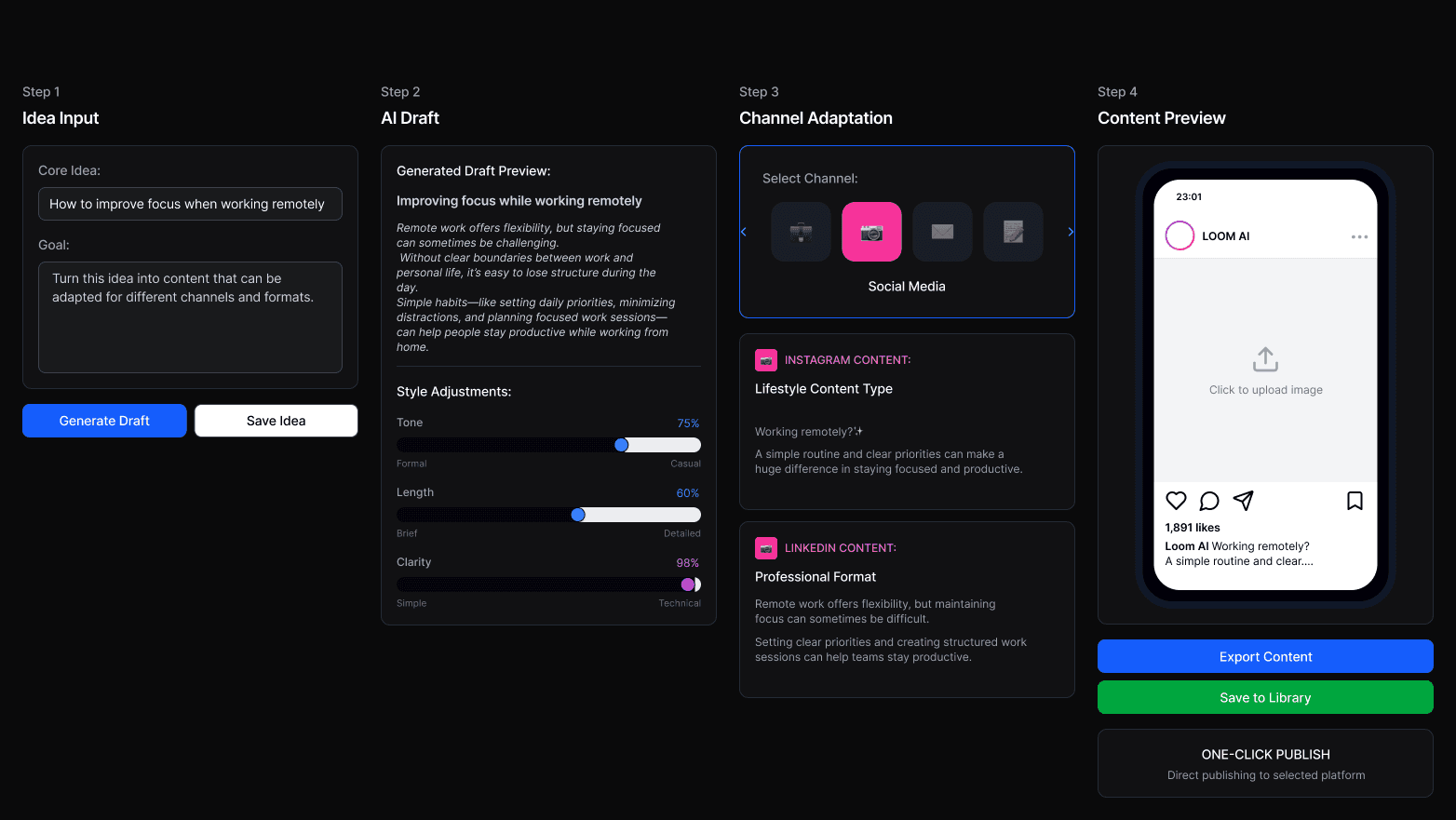 Loom AI helps users move from an initial idea to publish-ready content through a guided workflow.