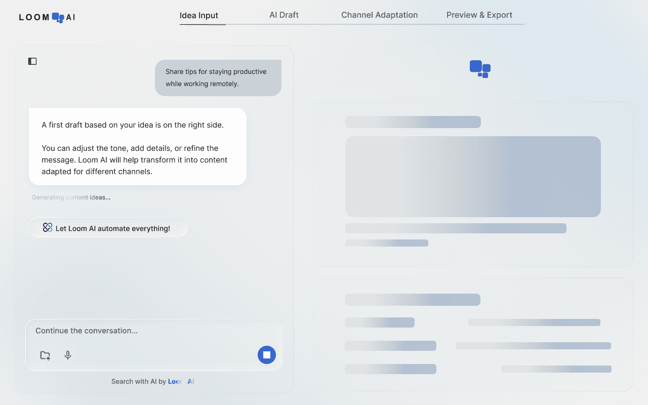 Loom AI is an AI-assisted content creation tool that helps users turn one idea into polished content across different channels and formats.